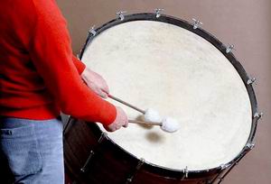 Две разновидности барабана - большой барабан и малый барабан - уже давно являются полноправными членами симфонического и духового оркестров. Они входят в группу ударных инструментов. Звук барабана не имеет определенной высоты, поэтому записывают его не на нотном стане, а на так называемой «нитке» - одной линейке, на которой отмечен только ритм.