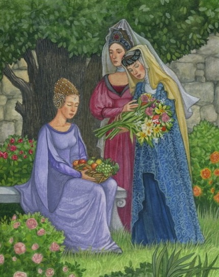 Проснувшись, Иоланта слышит незнакомые ей голоса и поспешно устремляется в сад. Она спрашивает незнакомцев, кто они и откуда, но Водемон, удерживаемый Робертом, отвечает не вполне определенно. Девушка предлагает рыцарям вина, однако Роберт, подозревающий западню, отказывается и уходит в лес на розыски приближенных.
