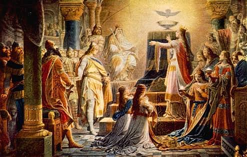 Вместе с Кундри и Гурнеманцем он отправляется в замок. Парсифаль исцеляет священным копьём рану Амфортаса и снимает покрывало с Грааля: чаша сияет в его руках. Белая голубица слетает из-под купола храма и реет над головой Парсифаля. Кундри, не сводящая с него глаз, падает мёртвой.